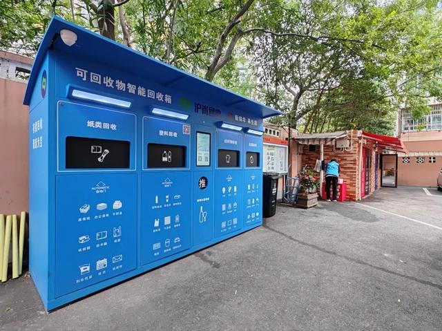 在垃圾箱房不遠(yuǎn)處,配置了一臺(tái)嶄新的“滬尚回收”可回收物智能回收箱,提供“玻金塑紙衣”等五類可回收物回收服務(wù),實(shí)現(xiàn)24小時(shí)全時(shí)段固定點(diǎn)位自助投放,有效滿足社區(qū)居民對(duì)家中閑置可回收物品的處置需求。